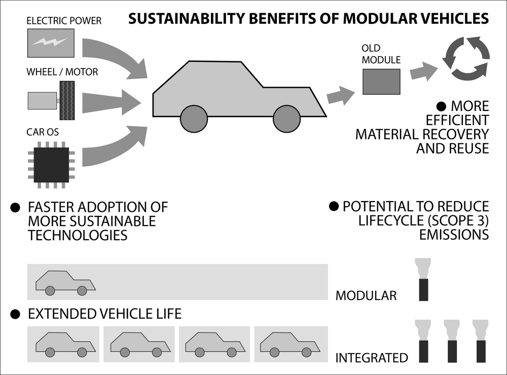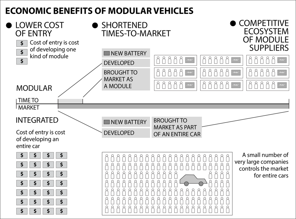 Changing from traditional car making to making modular electric cars could greatly increase innovation by reducing barriers to entry for car making, decreasing time to market for new technologies. Increased innovation could, in turn, address sustainability issues related to traditional car making, including issues related to climate change and dependence on fossil fuels.